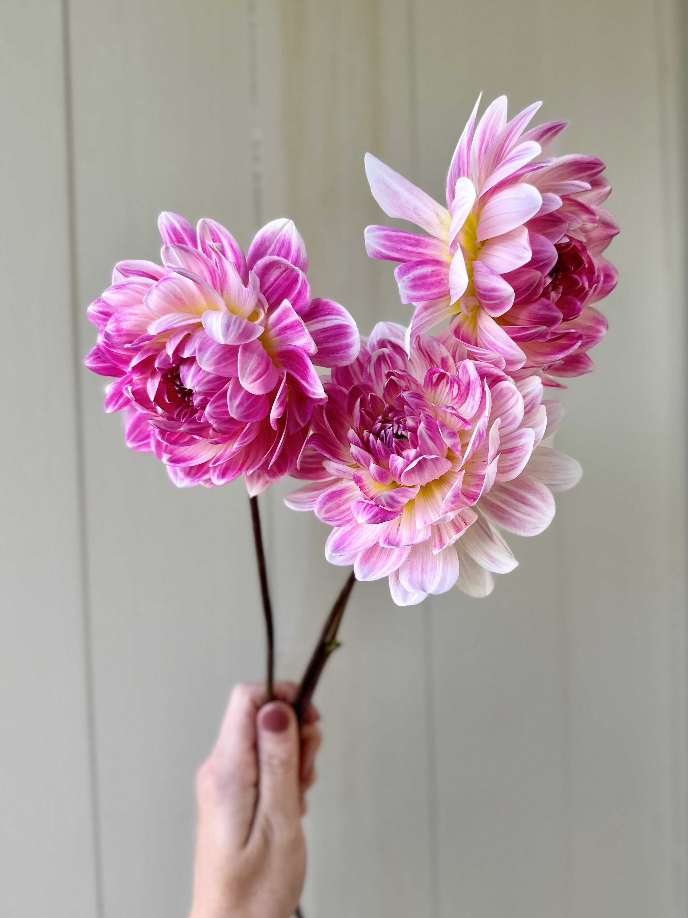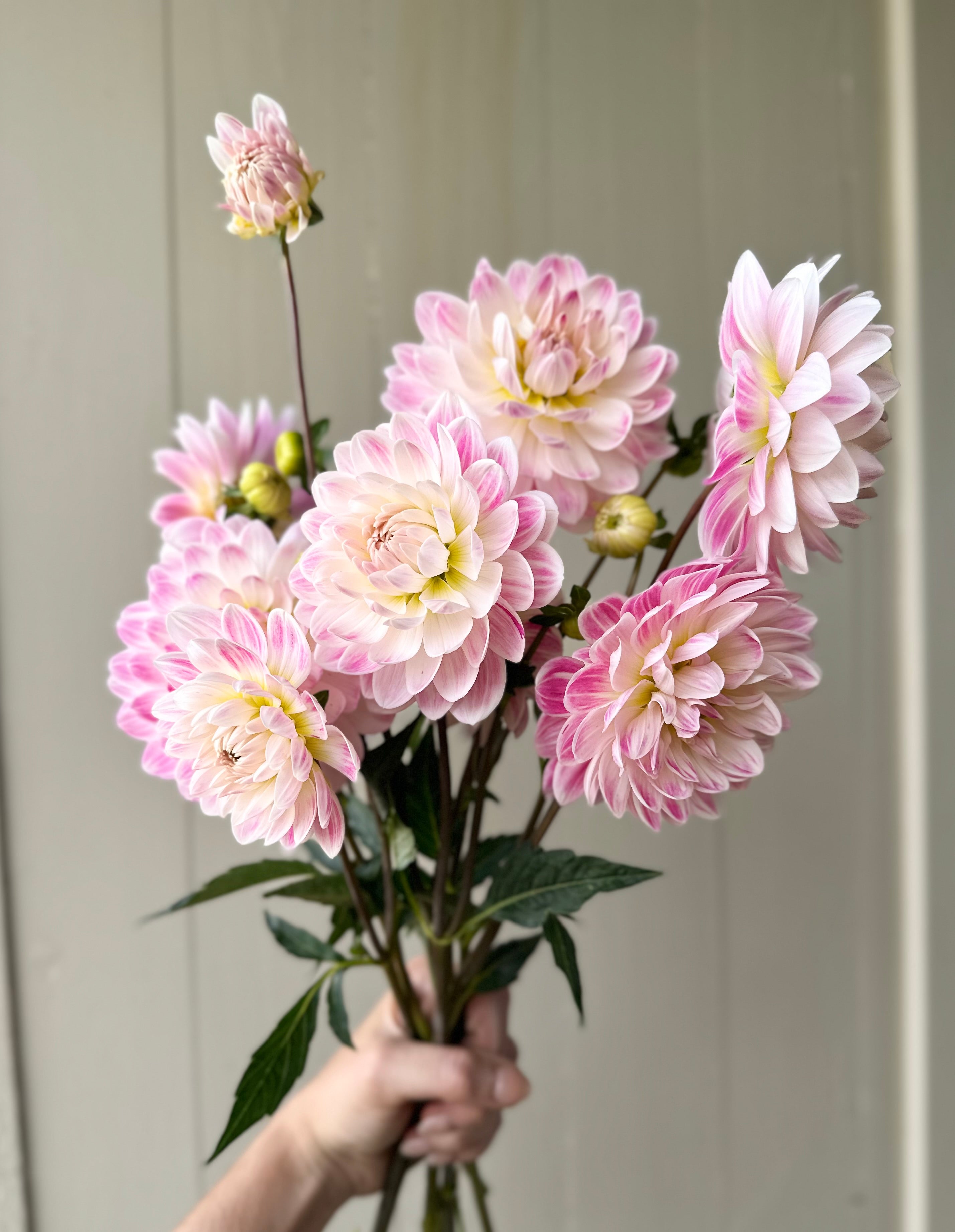 ’Kelgai Ann’ is a highly-coveted waterlily dahlia. In our fields I see a lot more color early in the season and towards October her petals fade into a white with barely there hints of blush.  Stunning for bridal work and gardens alike.